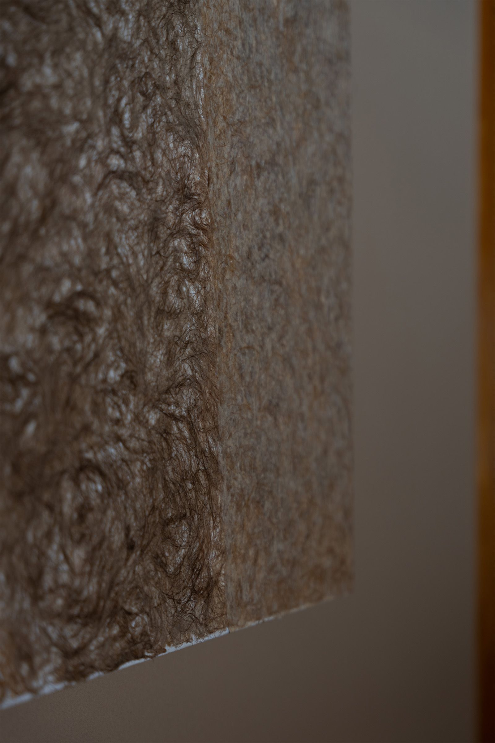 By transforming the inherent strength and delicacy of natural materials into paper, the work carries a presence that seems to speak through the material itself.