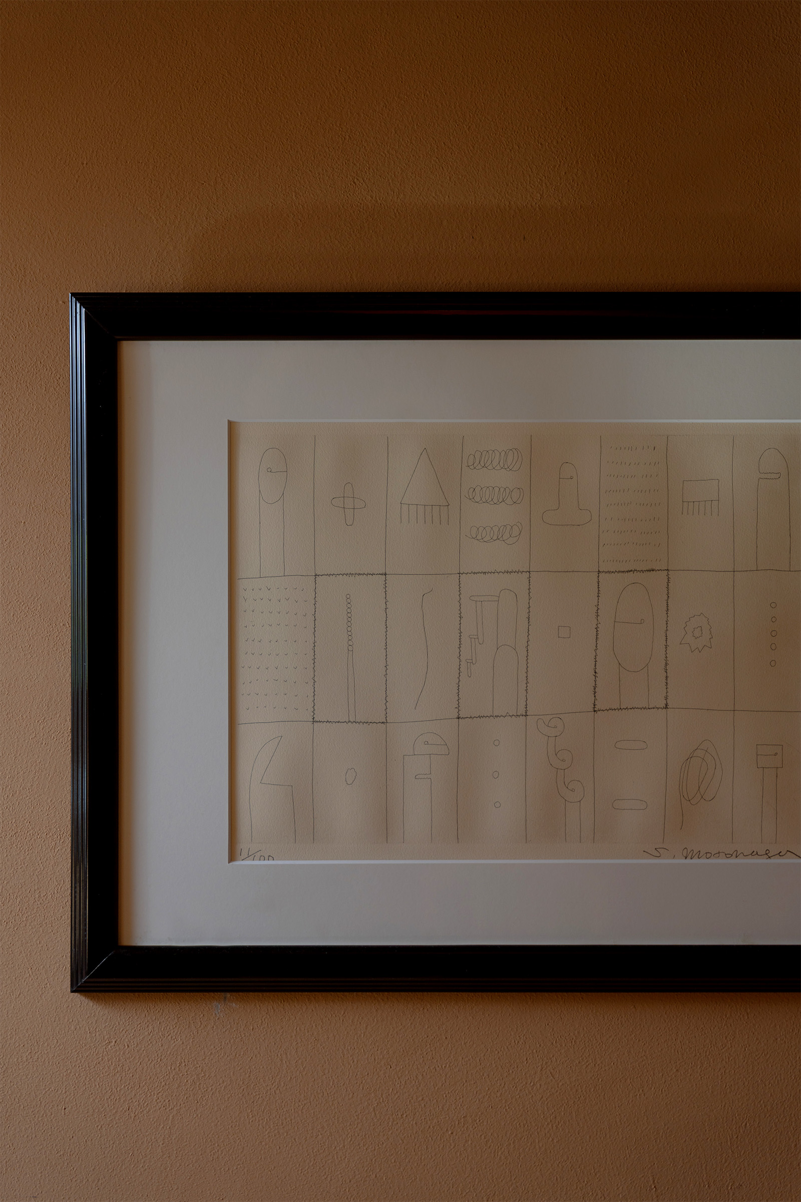 華道家の師匠が選んだ額装は、作品の素朴な表情を損なうことなく、料理とともに流れる穏やかな時間に寄り添うよう設計されています。