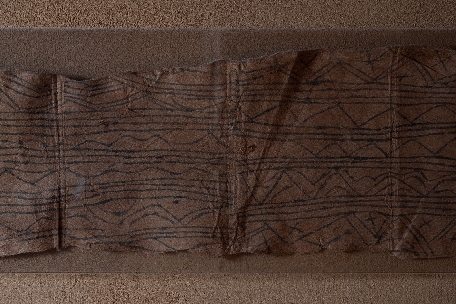 Tapa is a textile created by pounding tree bark until its fibers are loosened and shaped into a cloth. While tapa is most commonly associated with the cultures of Oceania and Polynesia, similar traditions can also be found in Africa and South America. This particular work was created by the Mbudi people, a Pygmy group known as inhabitants of the tropical rainforest.