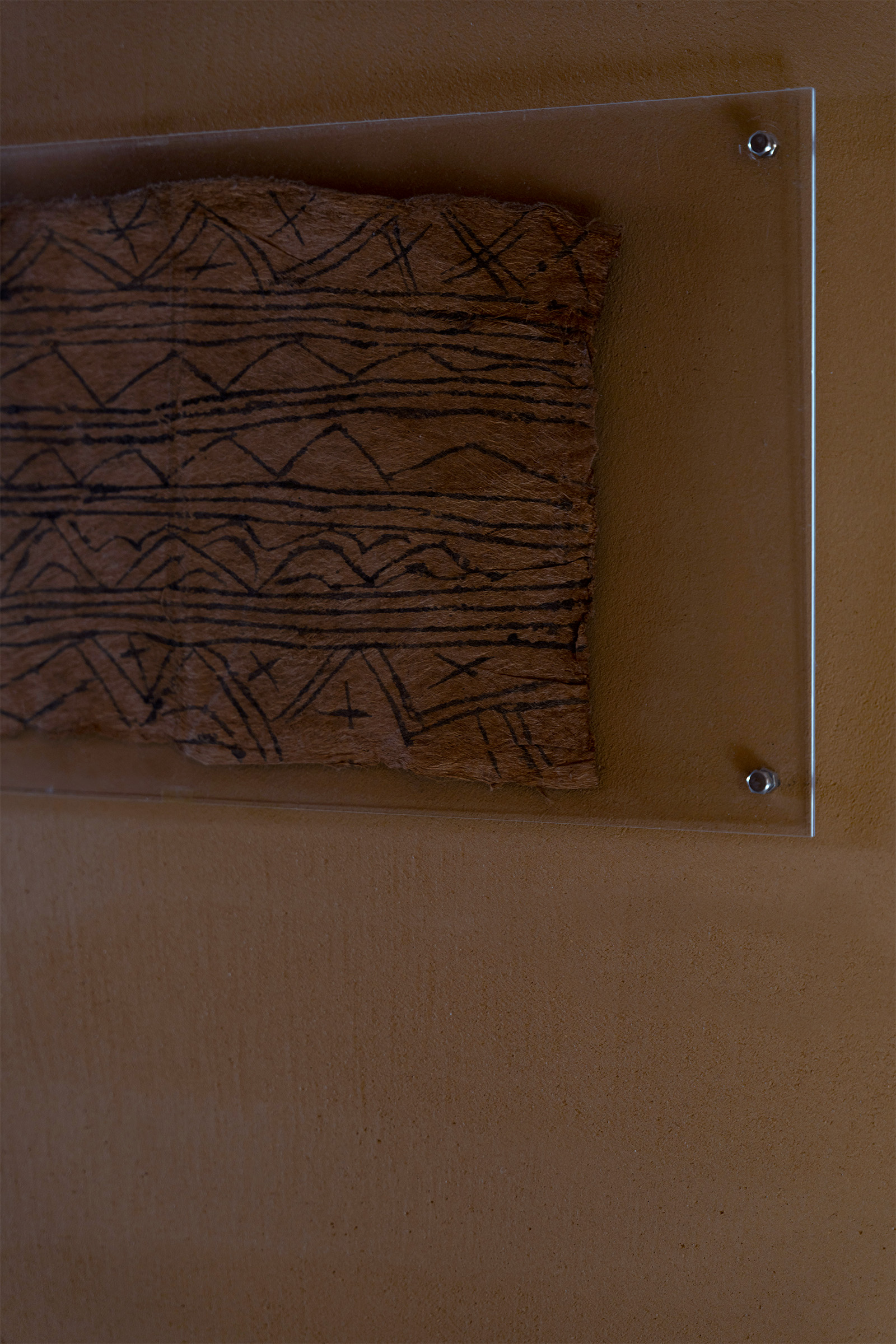彼らは移動しながら森や川から食料を得る、極めてシンプルな生活を営んできました。イチジク科の樹皮を数日間叩き続けて薄く伸ばし、乾燥させた布の上に、指や植物の茎、棒などで文様を刻んでいきます。その工程は装飾というより、祈りや記憶を刻む行為に近いものでした。
