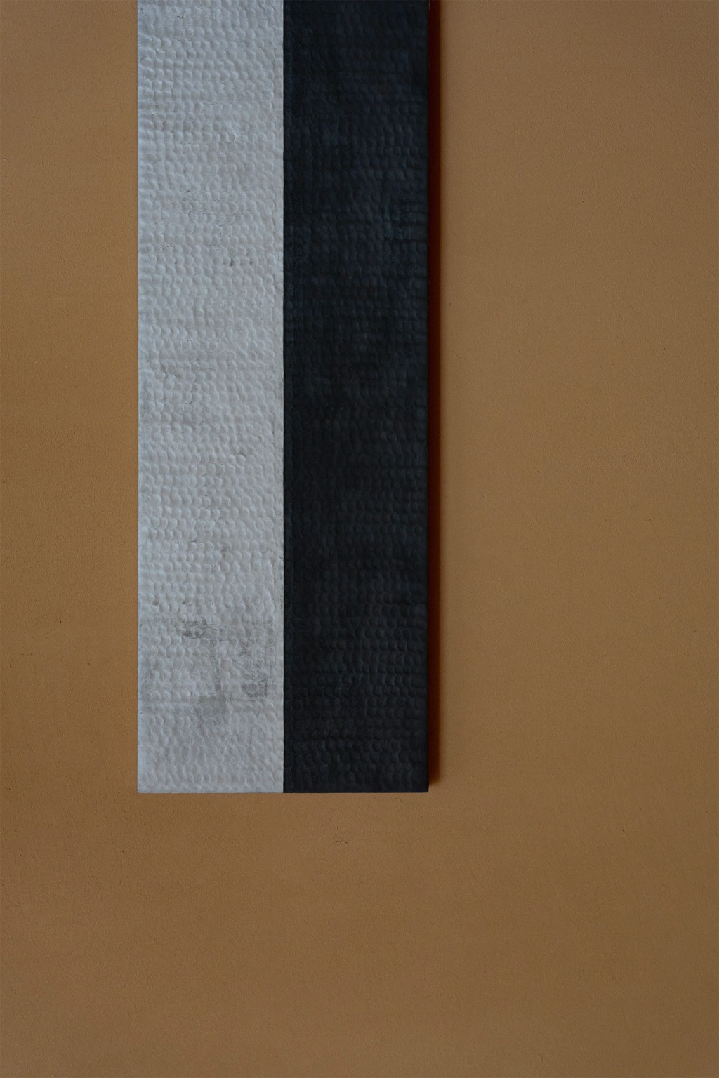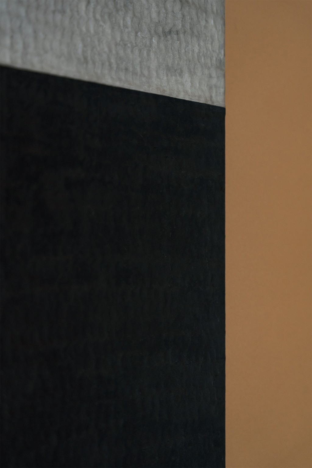 3点の作品はいずれもモノシリックな構成で、銀色のような光沢を放つ明部と、深淵を思わせる漆黒が織りなすコントラストで構成されています。細部に施された陰影や質感は、まるで和紙や漆のような温もりを感じさせ、日本の伝統的な美意識を内包しながらも、同時に現代的な冷ややかさと洗練を兼ね備えています。