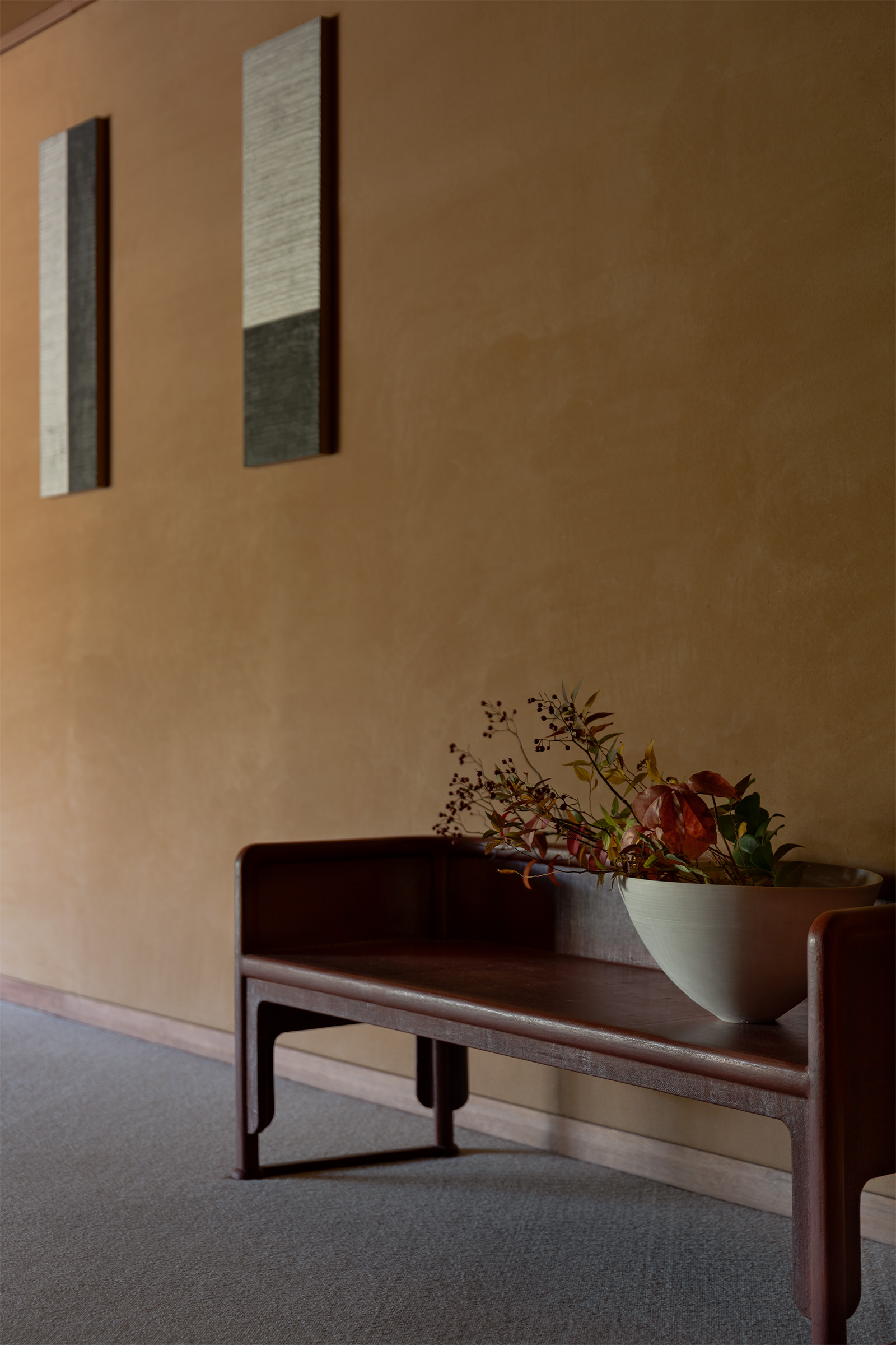 The inn’s proprietor first encountered this bench through a photograph in which flowers were arranged in a similar composition. Deeply moved by its presence, he immediately traveled to the Tokyo gallery where the photograph had been taken and decided to acquire the piece. Unlike any lacquer works he had encountered before, the bench possessed both a profound weight and an unmistakable sense of elegance.