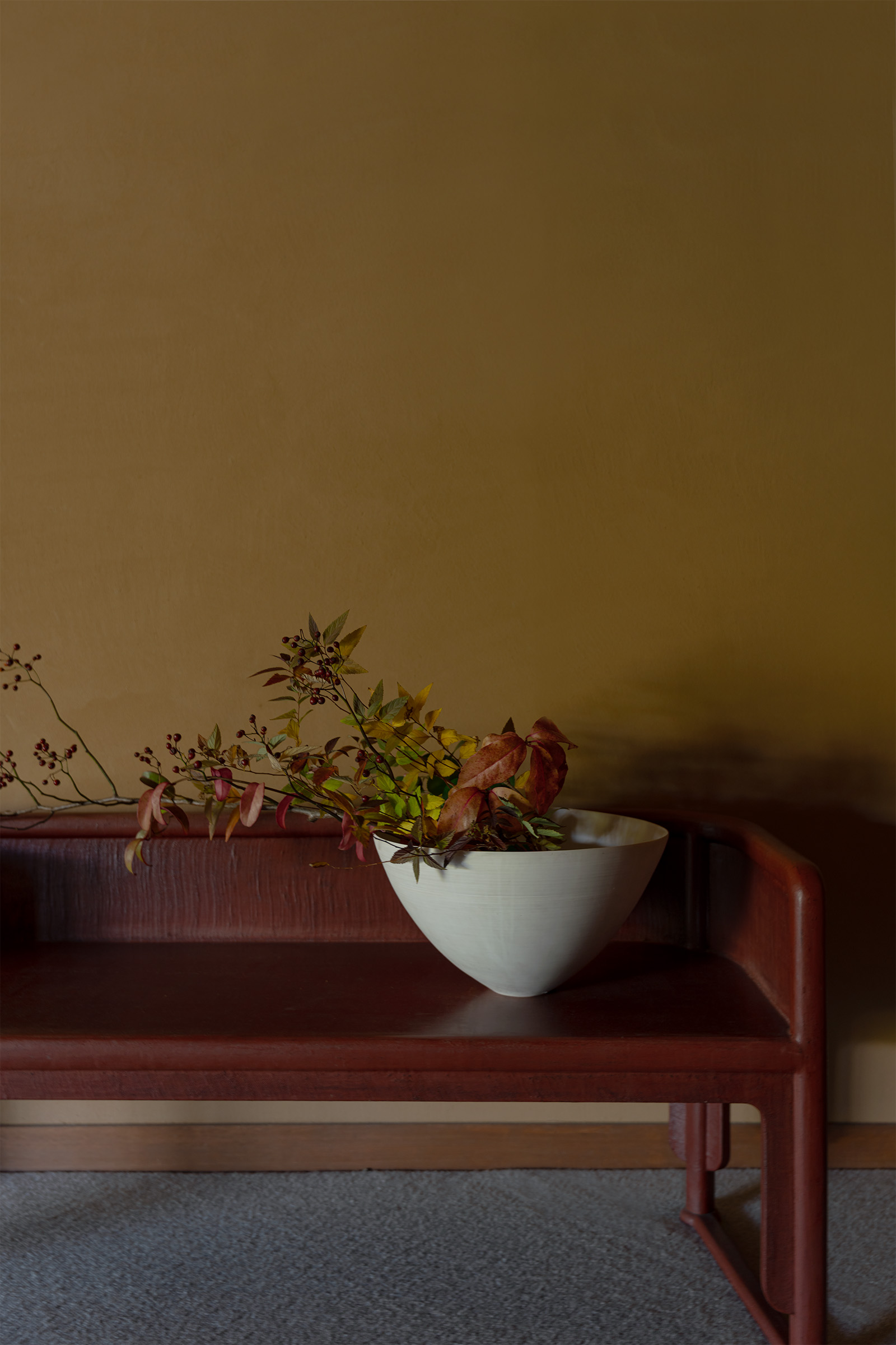 真白な白磁の花器、自然の姿を生かしたなげいれの花、そして深みのある漆の腰掛け。三者が互いを主張することなく響き合い、玄関という場をひとつの完成された景色へと導いています。この作品は、華野にとっての「添景」であり、訪れる人を静かに世界観へと誘う、最初の一歩なのです。