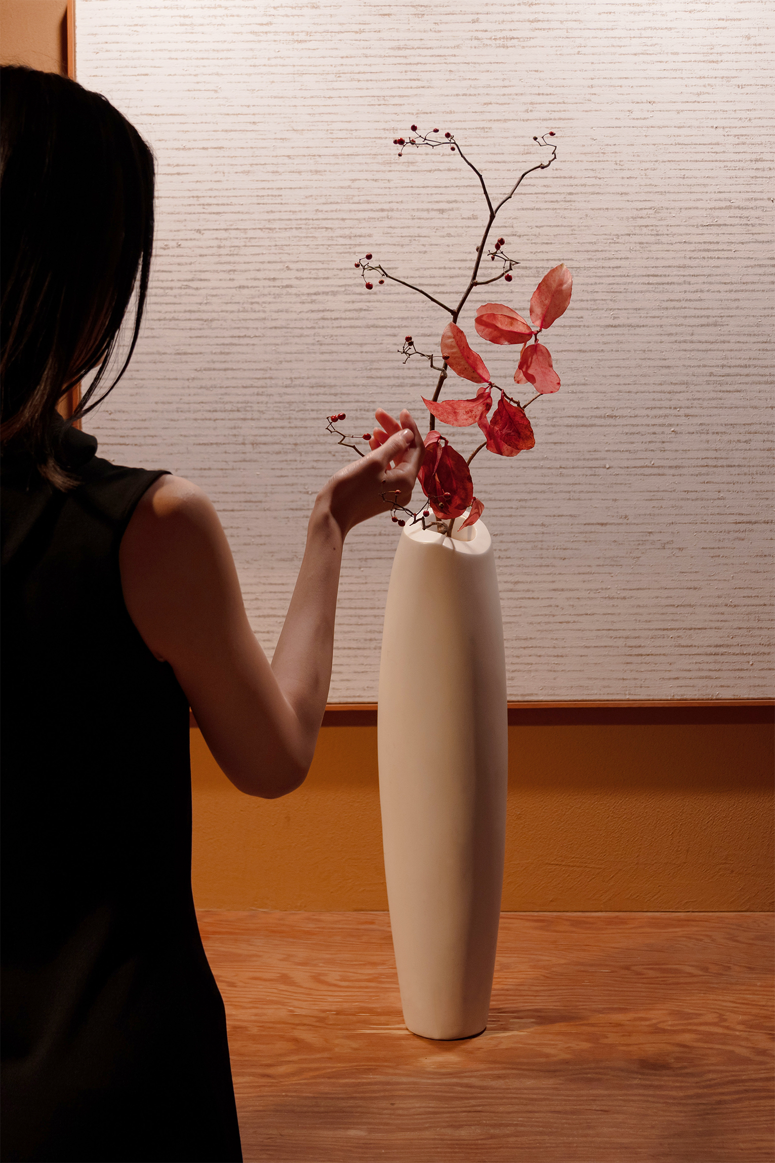 その手前に据えられたのは、フランスのデザイナー、カトリーヌ・メミ氏の手による花器。彼女は「ニュー・ミニマリズム」の旗手として知られ、その作品は日本の「禅」や「茶の湯」にも通じる精神性を宿しています。花器という枠を超え、一つのオブジェとして空間を支配するような、力強い静寂を纏っています。