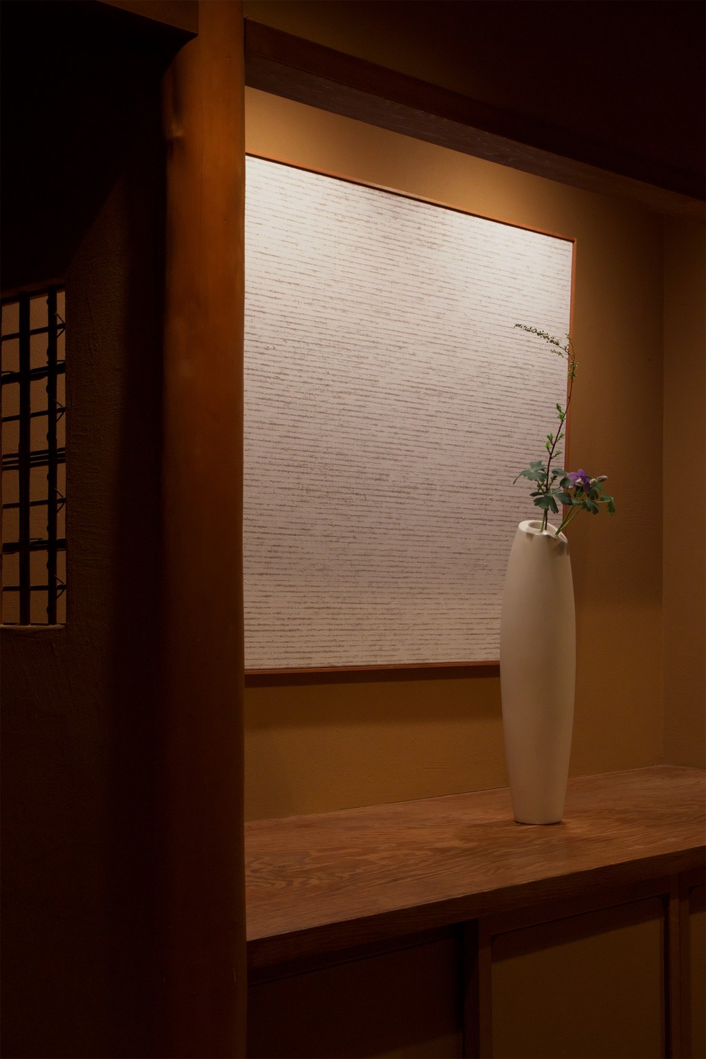 客室のある華野館へと続く長い廊下。その一端に設けられた「壁床(かべどこ)」と呼ばれるアルコーブに、二つの作品が静かな存在感を放っています。
