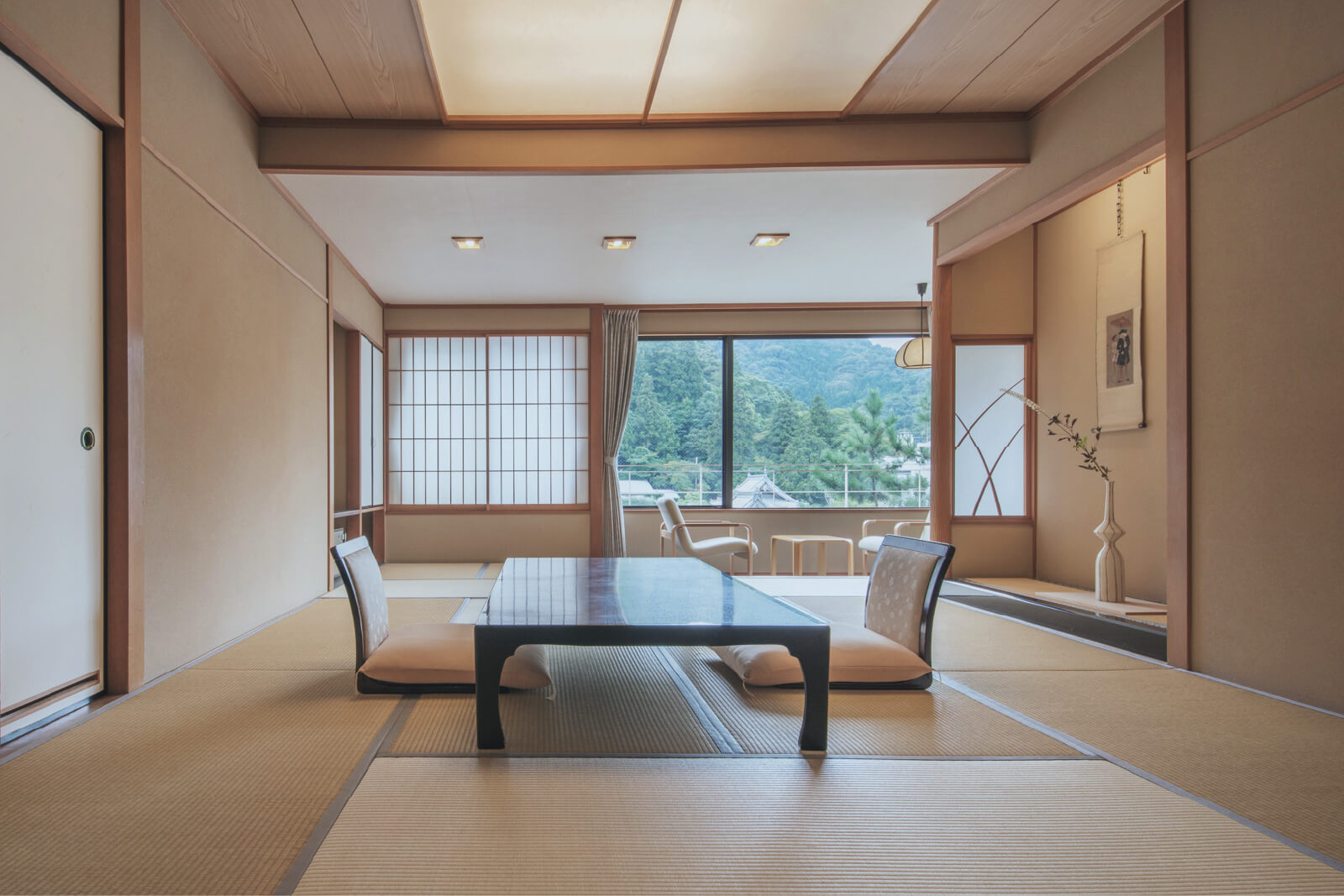 純和風の仕立てながら、ダブルのツインベッドを配置したお部屋です。広縁も備え、ごゆっくりお寛ぎながら木のぬくもりを感じていただけます。窓からは、有馬の街並みや山々をじっくりご堪能いただけます。