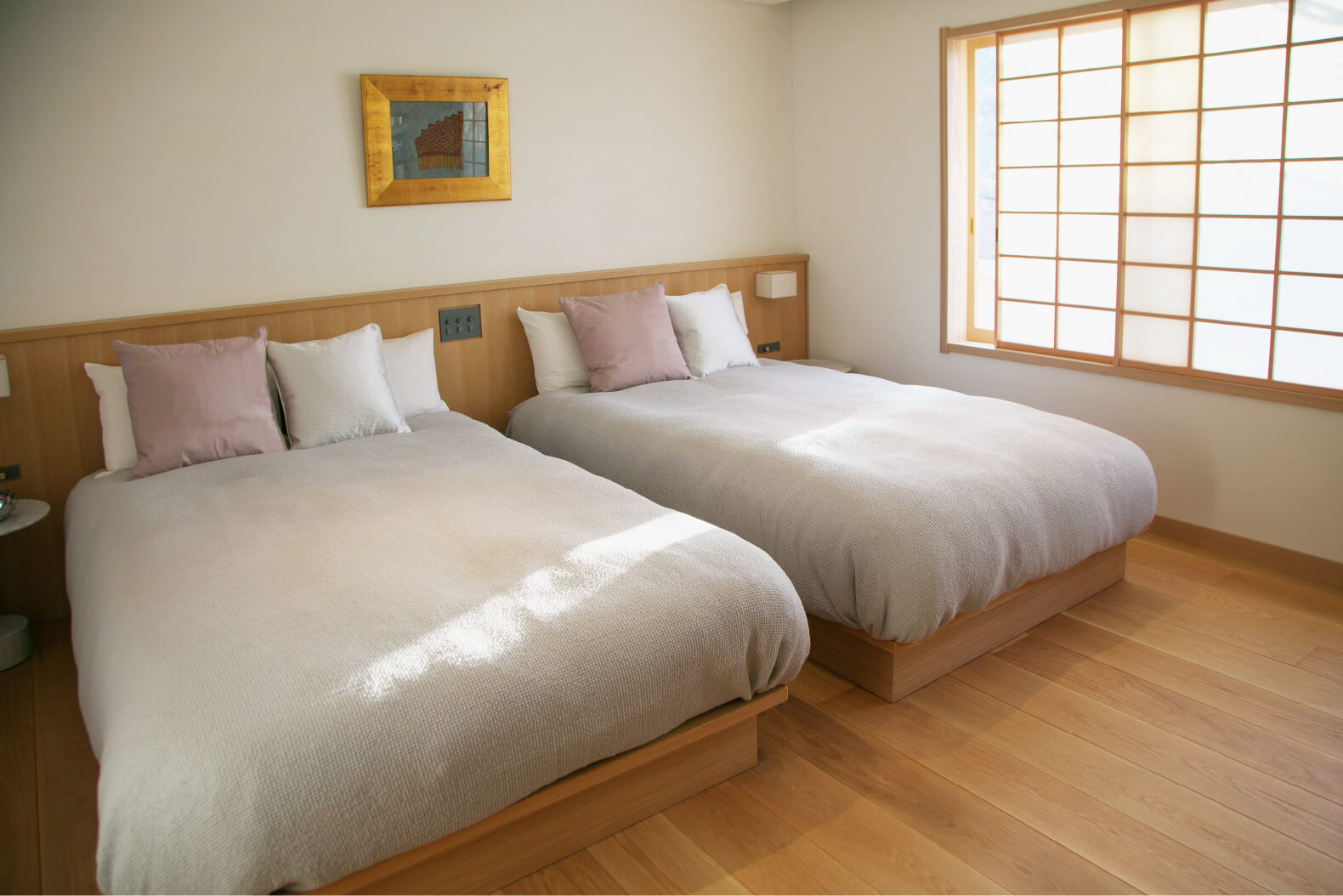 卧室采用吉村障子与白墙营造宁静氛围,橡木地板增添温暖。配备西蒙斯半双人床与Cassina家具,带来高品质舒适享受。在融合和洋美学的空间中度过安宁特别时光。
