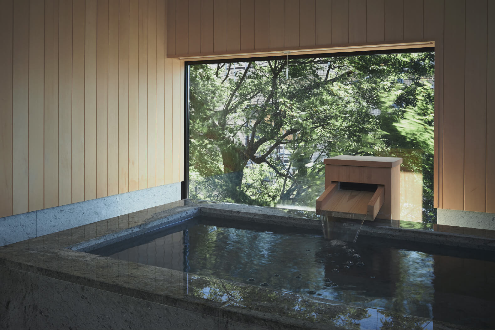 十和田石浴缸注入银泉,温柔包裹身心。墙面使用扁柏材,木香萦绕,营造放松氛围。温泉的温暖与自然材质的温润,带来极致治愈时光。