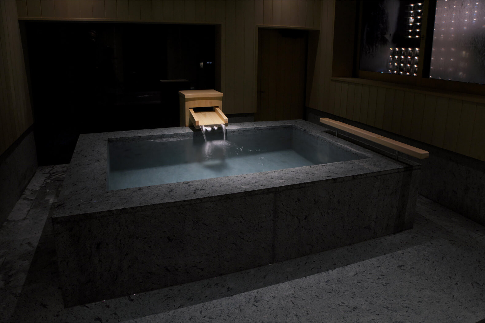 在内风吕中,可尽情享受注满十和田石浴缸的银泉,放松身心,忘却日常。房内配有西蒙斯半双人床和Cassina家具,提供极致舒适体验。
